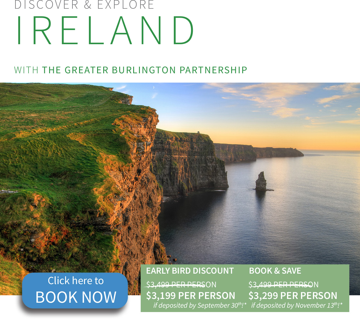 Discover Ireland with the Greater Burlington Partnership and Chamber of Commerce. The 8 Day adventure to Ireland departs on April 17, 2024.