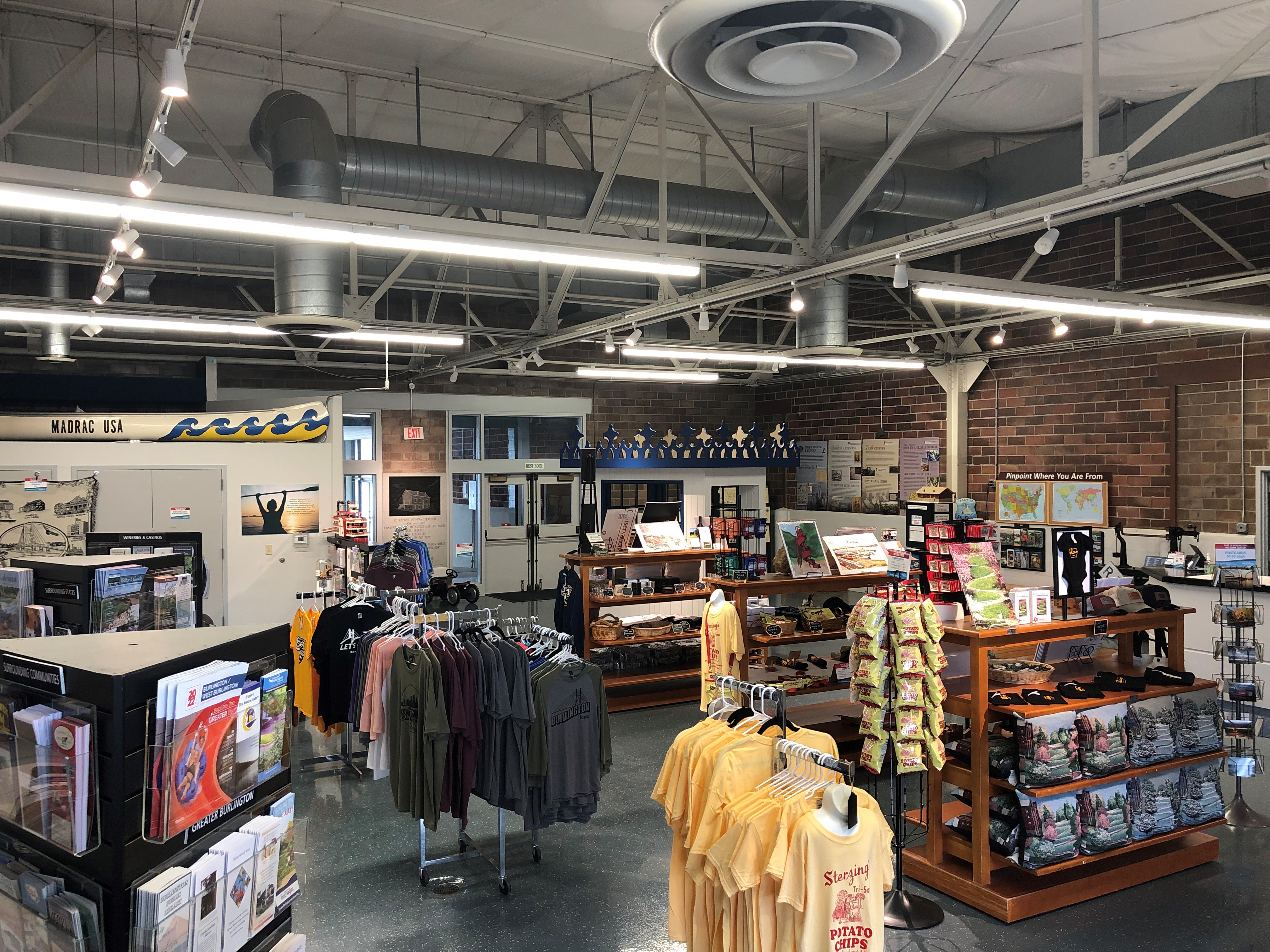 The Welcome Center is a great place to start. The Center has all of the information you need to know about Burlington. There are tons of pamphlets about things to do and places to see in the area, and in surrounding areas. There is also information about the history of Burlington including the Burlington timeline, the history of the rail system in Burlington, the Burlington mural, which was done by local artist David Garrsion, and there are also books about Chief Black Hawk, who was a leader of tribes in the area. Of course there is also a large array of Burlington merchandise to take home with you.